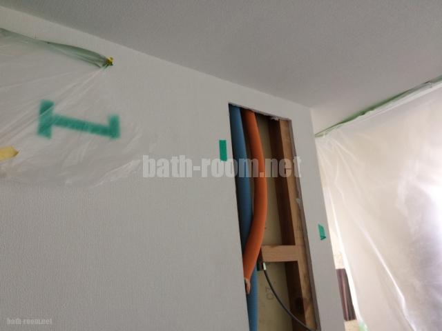 配管替えも同時に行いました。キッチンに行くお湯と水の配管は天井より壁内を通します。