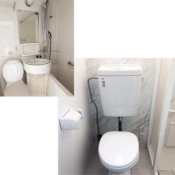 解体前のユニットバスと施工後のシャワー&パウダーのトイレ側です。